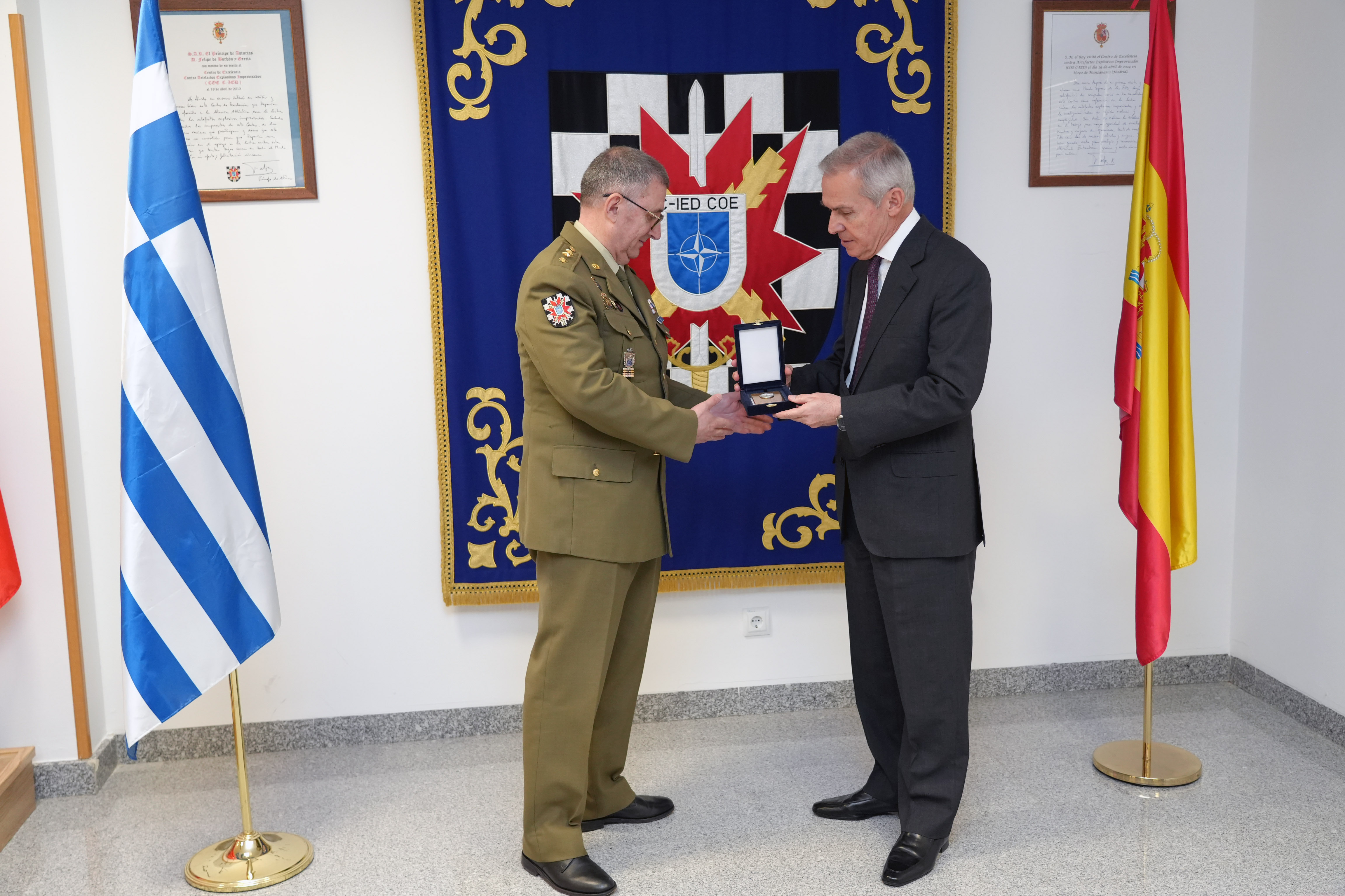 A delegation of the Hellenic Republic, headed by its deputy minister of National Defence, Mr. Athanasios Davakis, visited the Counter-Improvised Explosive Devices Centre of Excellence (C-IED COE), where they were received by its Director, Colonel Javier Sanz Maldonado, Branch Chiefs and the Greek officer serving at the Centre.